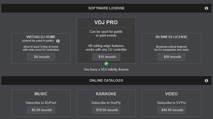 Interesting to see that there's now a $4 per month home subscription shown inside VDJ alongside the $19 Pro subscription - but no Pro Infinity option!
