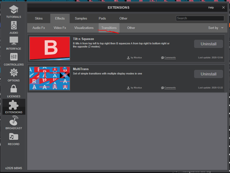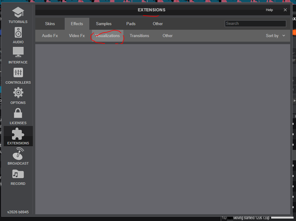 In VDJ2025, you could "uninstall" or "reinstall" internal plugins from the extension page. in VDJ2026, this is now done in the fx list editor, so the extention page now only shows real third-party plugins (and nobody made any for visualization)