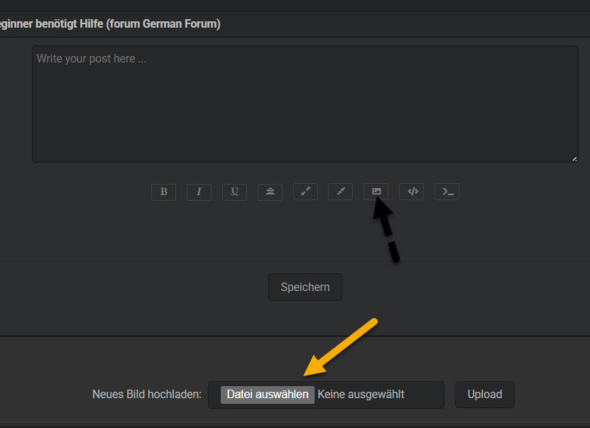 2. es erscheint dann unten (siehe gelbe Pfeil) die Möglichkeit Bilder vom Computer auszuwählen Upload-Button dann nicht vergessen zu drücken