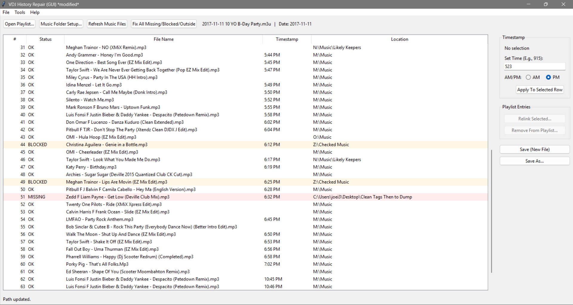 Only using Save As / Save New function so original history playlist stay intact. Has been working good for me so figured I'd see if there was any interest.