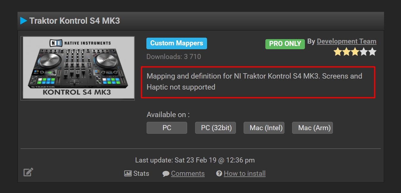 Außer diesen beiden Dingen, die ich aber nicht für essentiell wichtig halte, funktioniert der Rest aber perfekt. Auch die Jogs...nur eben ohne Haptik bzw. Motor. In den Screens bleibt halt "Traktor S4 MK3" stehen. Na und? Die sind sowieso so klein, dass das nicht ins Gewicht fällt. Habe den ebenfalls und benutze ihn vorwiegend für meine Radio-Sendungen. Für meine Live-Gigs nehme ich nen Denon Prime 4+