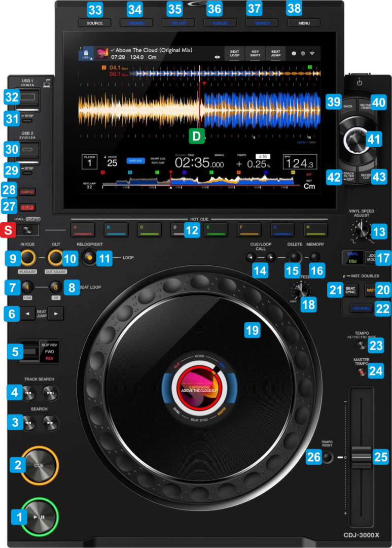 Hold SHIFT down and then use this button to cycle through Hotcues, Stems and Sampler mode for the HOTCUE buttons17 JOG MODESelect the VINYL or CDJ mode for the Jogwheel18 JOG ADJUSTAdjust how heavy or light the Jogwheel will be19 JOGWHEELUse the jogwheel to Scratch , pitch-bend or adjust the entry and exit loop positions. When VINYL mode is enabled, use the upper/inner part of the wheel to Scratch the track backwards/forward and the outer part (side) to pitch-bend (temporary speed-up/slow-down tempo) When CDJ mode is enabled use any part of the jogwheel to pitch-bend (temporary speed-up/slow-down tempo) See LOOP controls for loop in/out adjust. The small LCD screen will display the Album Art of the loaded track, the CUE position and a track rotation marker20 Master Use this button to manually set the Deck as Master . When a Deck is set as Master , all other Decks will sync to the Master Deck, if SYNC is pressed.21 BEAT SYNCUse this button to synchronize Tempo (BPM) and Beat phase to the other Deck or Master Deck - if more than 2 Decks are used.22 KEY SYNCUse this button to match the Key of the track with the opposite Deck. Press again to reset the Track's key back to its original value.23 TEMPO RANGEUse this button to select the % range for the Pitch fader. On each press, the range will cycle through 6,10,16 and 100%. The selected range is displayed on the LCD of the unit24 Master TEMPOUse this button to enable/disable Master Tempo (Keylock). When enabled, pitch/tempo changes will not affect the Key of the track25 TEMPOUse this fader to adjust the tempo (BPM) of the track. In middle position, the track will play at its original tempo (BPM). The pitch% and BPM value are displayed on the LCD of the unit.26 TEMPO RESETUse this button to gradually reset Track's tempo back to its original value.27 SLIPEnable/disable Slip mode. When enabled, several actions such as holding the platter, loop and Hotcues will act temporarily and once performed, track will resume to the position it would have been if the action was never performed28 QUANTIZEEnable/disable Quantize mode. When enabled, several actions such as Loops and Hotcues will be quantized (snapped) to the nearest beat or other beat fraction depending on the globalQuantize value (from VirtualDJ Settings)29 USB-2Insert a compatible USB type-C media storage device. This source is not used when the device is assigned to VirtualDJ30 USB STOP-2Press and hold this button to eject the USB storage device connected to USB-2. This operation is not used when the device is assigned to VirtualDJ31 USB-1Insert a compatible USB type=B media storage device. This source is not used when the device is assigned to VirtualDJ32 USB STOP-2Press and hold this button to eject the USB storage device connected to USB-1. This operation is not used when the device is assigned to VirtualDJ33 SOURCEUse this button to select a Source for the device. When the device is connected to a computer running VirtualDJ, select the CONTROL MODE (CDJ), then press the BROWSE rotary [41] to apply your sleection34 BROWSEUse this button to toggle between the Library/Browser and Deck view35 TAG LISTNo functionality is offered in CONTROL MODE36 PLAYISTNo functionality is offered in CONTROL MODE37 SEARCHNo functionality is offered in CONTROL MODE38 MENUPress and hold this button to enter the CDJ-3000X Utilities menu and adjust screen and jogwheel brightness. No other functionality is offered in CONTROL MODE39 BACKWhen in Browser view mode, use this button to get the Folders list view. If focus is in Folder view, use this button to open/close sub-folders (if exist)40 TAG TRACKLoads the selected Track to the Automix List41 BROWSE ROTARYWhen in Decks view, use this rotary to zoom in/out the waveform of the loaded track. When in Browser view : Use the rotary to scroll through files or folders. Push the rotary to see the tracks of the selected folder (if in Folders view) or load the selected track to the Deck (if in Tracks list view)42 TRACK FILTERNo VirtualDJ functionality is assigned to this button43 SHORTCUTUse this button to get a screen with Shortcuts/Setting. When using VirtualDJ (CONTROL MODE) only the Brightness settings are available. No other VirtualDJ functionality is assigned to this button
