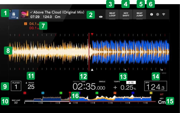 1 SOURCEIndicates the selected Source. 2 TRACK INFODisplays Track's Album Art, Title, original length and Key. Tap to hide Track's Title3 BEAT LOOPTap to show/hide a panel with quick Loop buttons on the screen4 KEY SHIFTTap to show/hide a panel with Key move/shift and Key reset buttons on the screen5 BEAT JUMPTap to show/hide a panel with quick Beat Jump buttons on the screen6 SHOW TRACK INFO Tap to get a small pop-up display with additional Track's info7 BEAT COUNTERDisplays the Beats remaining to the next Hotcue (upper text for Master Deck, lower text for Device's Deck)