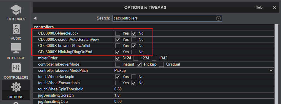 - NeedleLock : When set Yes, touching the Progress wave on the Display will not have move the track if the Deck is audible