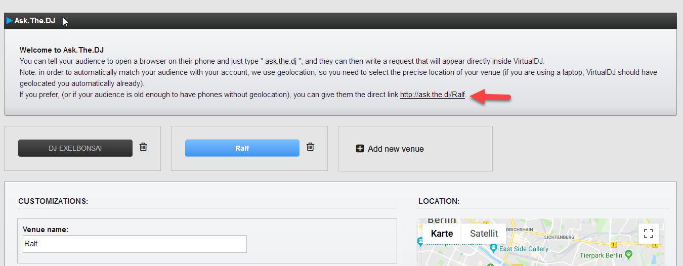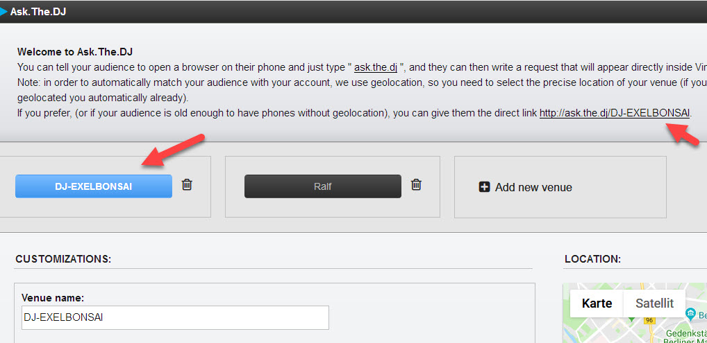 Sobald Sie einen Veranstaltungsort eingerichtet haben, können Sie Ihr Publikum an die SMS-Webadresse zu Ask the DJ verweisen