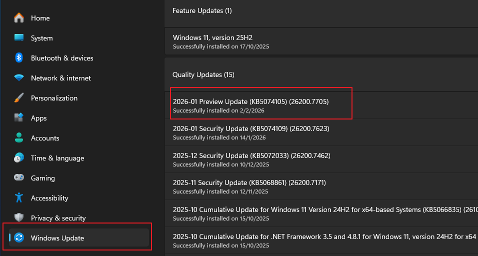 Look for the 2026-01 Preview Update (KB5074105) (26200.7705) to verify the installation. If you don't see this, then you have probably not installed it and your controller should work. If not please see Controller Not Working