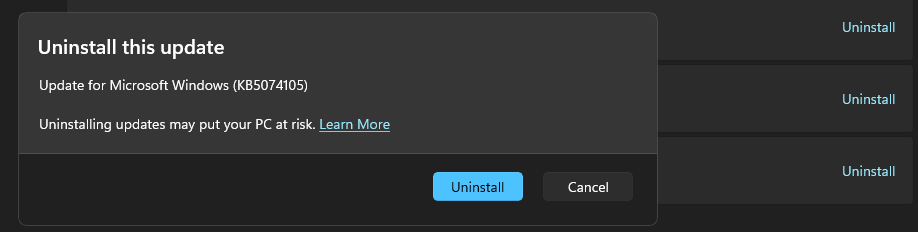 If you see the above, then scroll down and click to "Uninstall Updates".