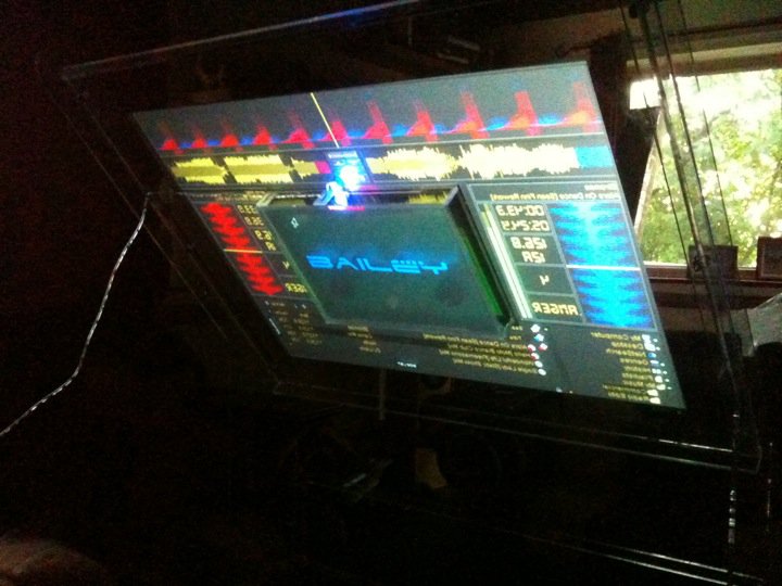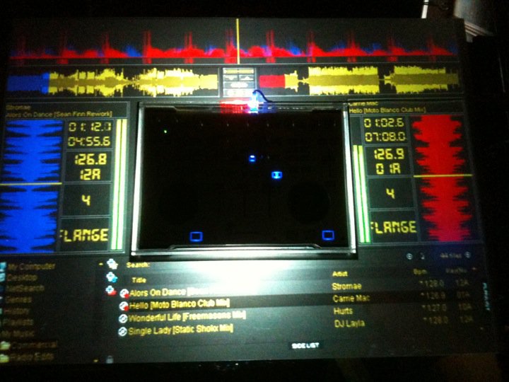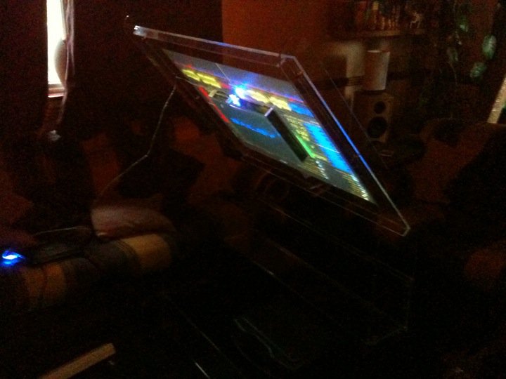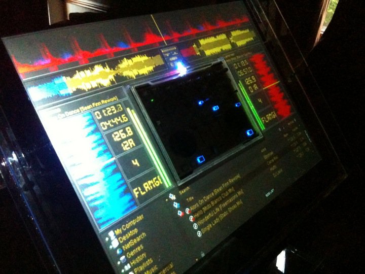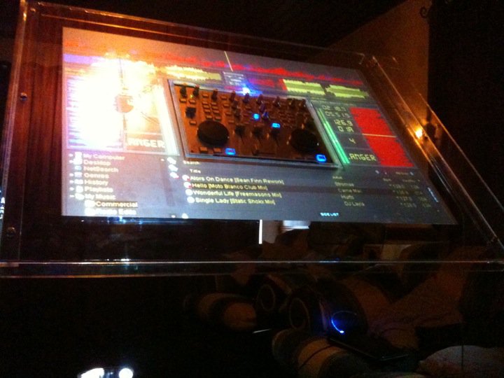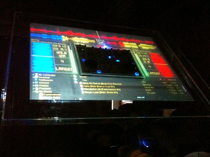 The image is back projected onto the screen, and no, it's not a touchscreen, all control of VDJ is undertaken by the use of the embedded MIDI controller (a Hercules DJ Steel in this case - it's had the steel case removed and a brushed steel effect covering applied to the inner plastic case face).