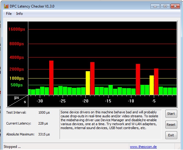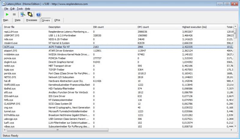 Startet den Latenzmonitor, klickt auf Drivers und dann auf das grüne Dreieck. Sortier dir dann die Liste nach Highest execution. Werte die größer als 1 ms sind nicht gut.