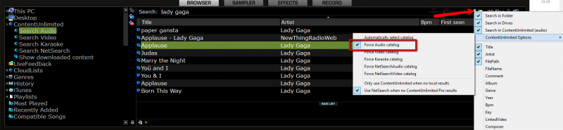 My Content unlimited Audio has also stopped working since Thursday 19th June... When i try to search it just stays blank... I am able to refresh cache on current downloads but can not find or download anything new... When i search it just says " Netsearch Looking For Songs" but neither grooveshark or Netsearch results appear... What i have found is VDJ 7.4 is not working with content unlimited but VDJ 8 is working fine with content unlimited....