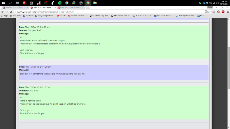 Background: VirtualDJ 7.4 and all previous versions played DRM music files. Version 8.0 did not. For myself and many others, this fact is an absolute deal-breaker, rendering 8.0 totally unusable, necessitating that we remain with version 7.4. I noticed this flaw immediately on the day 8.0 came out in May of 2014, within a few seconds of trying it. I promptly posted to the forum, resulting in a great deal of outcry from others as well.