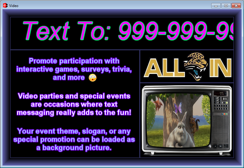 TellyVisuals offers the best layout, scrolling text and images, and more. TV manages content and placement with panels which can be moved and sized however you like. All panels can contain images, borders, and color. Here the top panel is marquee panel scrolling text back and forth. Marquee panels can scroll text and images. The ALL-IN is just a sample image. Below that I have the VDJ video playing in an old school television. Any panel can capture the VDJ video which can then be moved and sized, borders added to it, and more. To the lower left is some sample text messaging. Text messaging is only available in the plus version of TV. It supports over 800 smileys including the emoji emoticons.