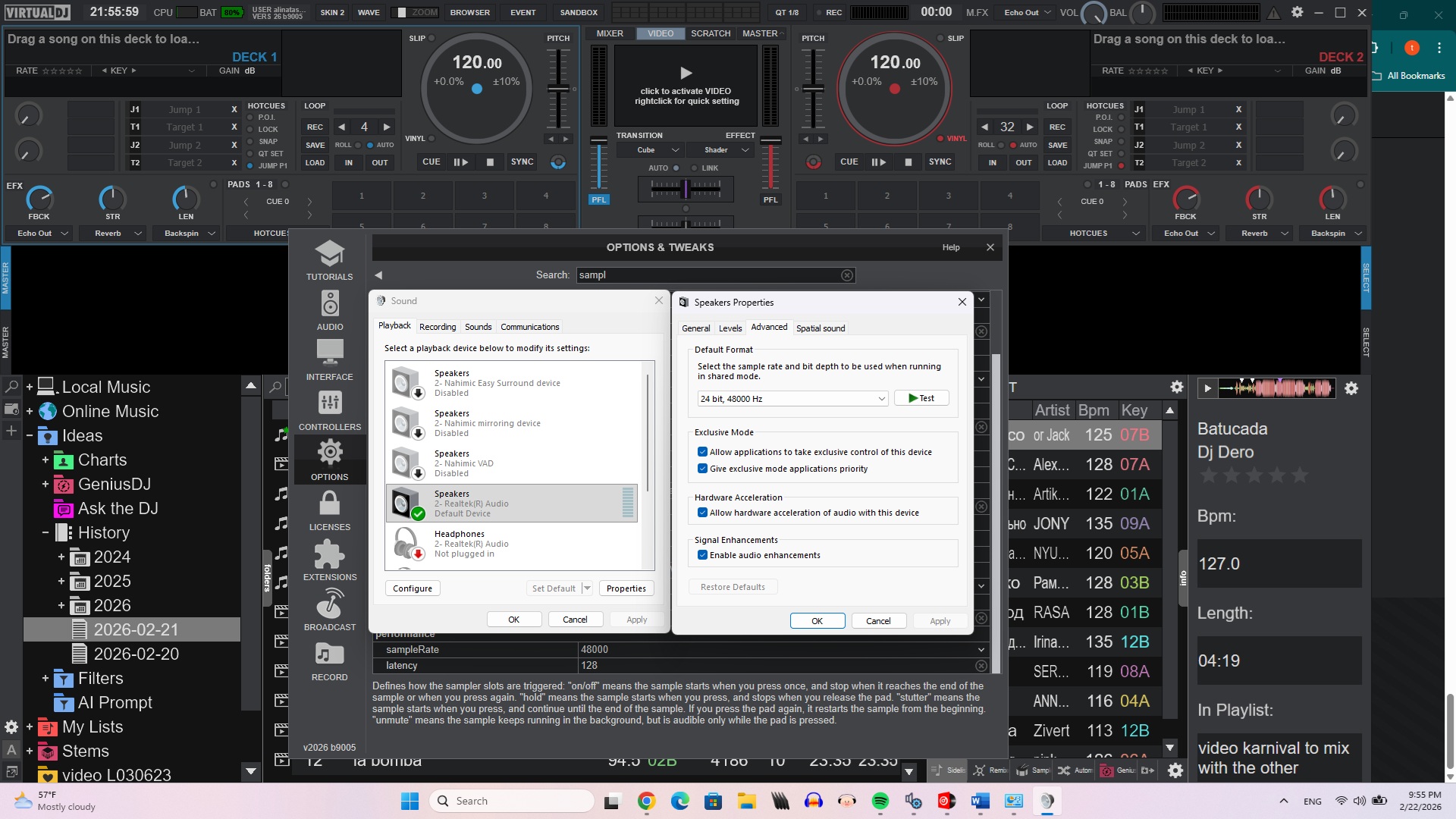4 channel, 24 bit, 48000hz (αυτό ήταν ήδη κλικ από την αρχή), (Studio Quality). Εγώ το αλλάξα και το έβαλα στο 4 channel, 24bit, 44100hz (Studio Quality). Θα το βάλω μια και στο 4 channel, 16bit, 44100 Hz (CD Quality) να δω εάν θα έχει διαφορά. Στο Virtual Dj προσπαθώ να το βάλω στο automatic αλλά πάλι δεν το αποδέχεται αλλά πάει στα 44100. Τι να κάνω; Έχω μπερδευτει φουλ....