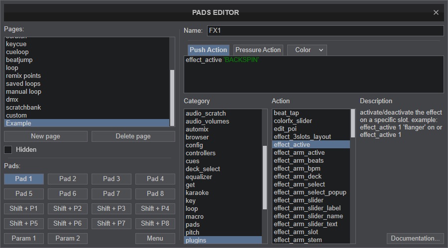 Pelo que o Speedy53 colocou no código ele está definindo que o efeito que será atribuído no PAD é o backspin, não necessariamente é o que esta na aba de efeitos. O código é robusto e você pode configurar do jeito que achar mais interessante. Seguem dois exemplos.
