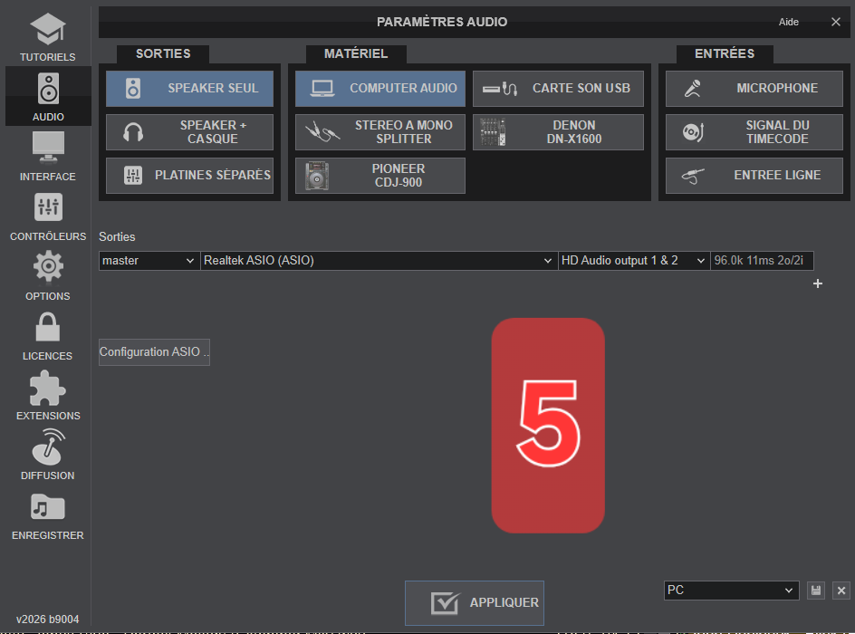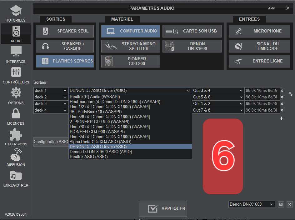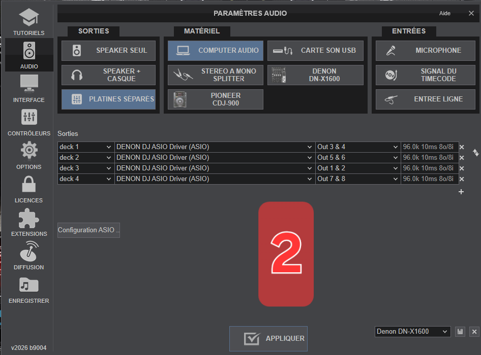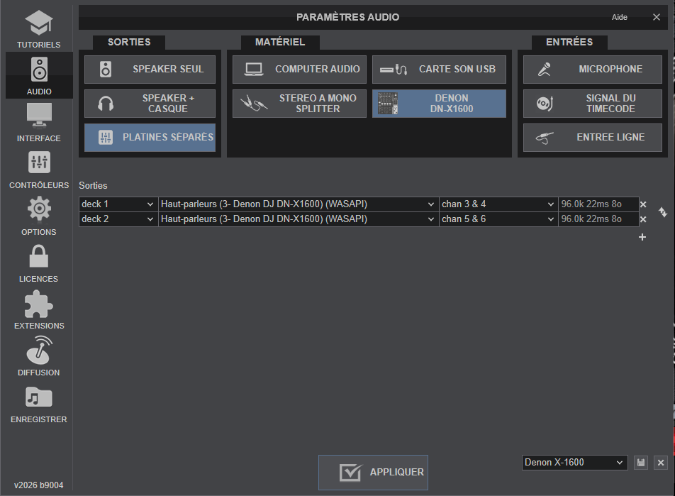 Quand je clique sur DN X-1600, dans les paramètres j'ai bien les pilotes Denon asio par défaut.