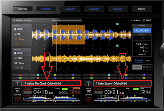 The controller (XDJ-RX3) screen is designed to show TRACK'S TITLE