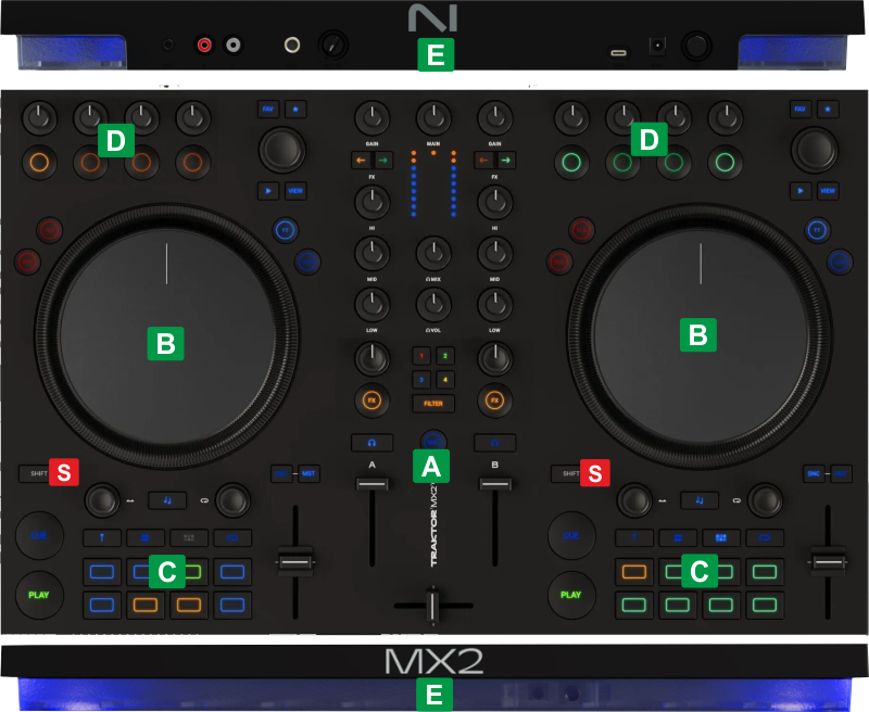 S SHIFT. Hold this button down to access secondary functions of the Kontrol MX2.