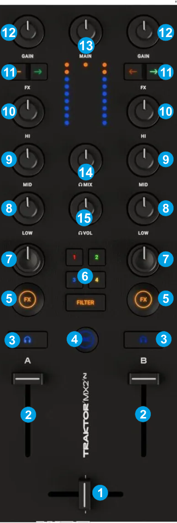CROSSFADER: Blends audio between the left and right channels/decks.