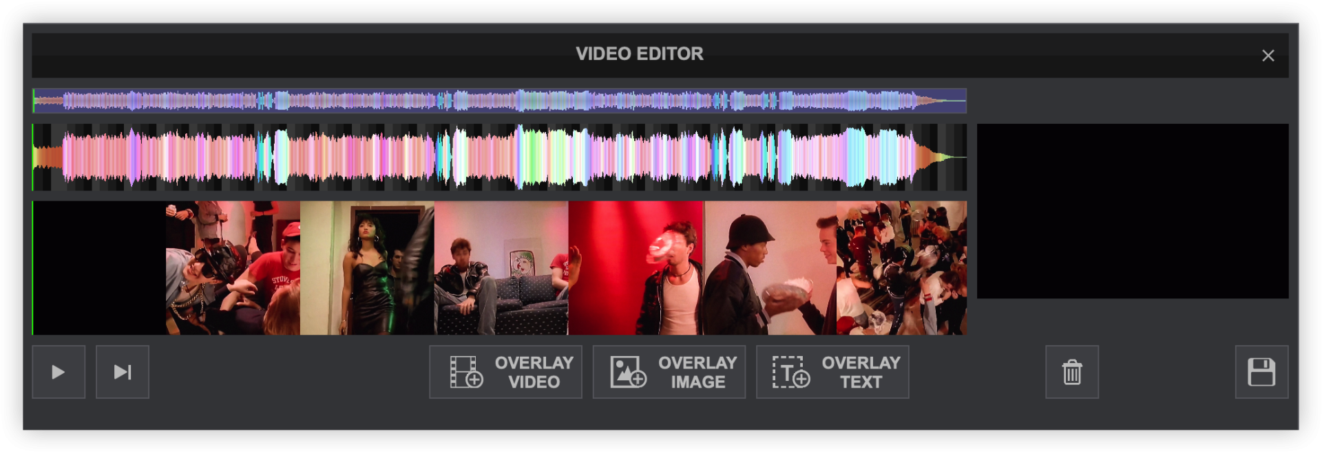 - Once the Video Editor is opened, the multi-colored waveform will be displayed providing the tracks audio information. If the track is Audio only, the Video Timeline and Video Preview will be empty. If the track is a Video file, the Video Timeline will display the entire video and the Video Preview will be stopped on the first frame.