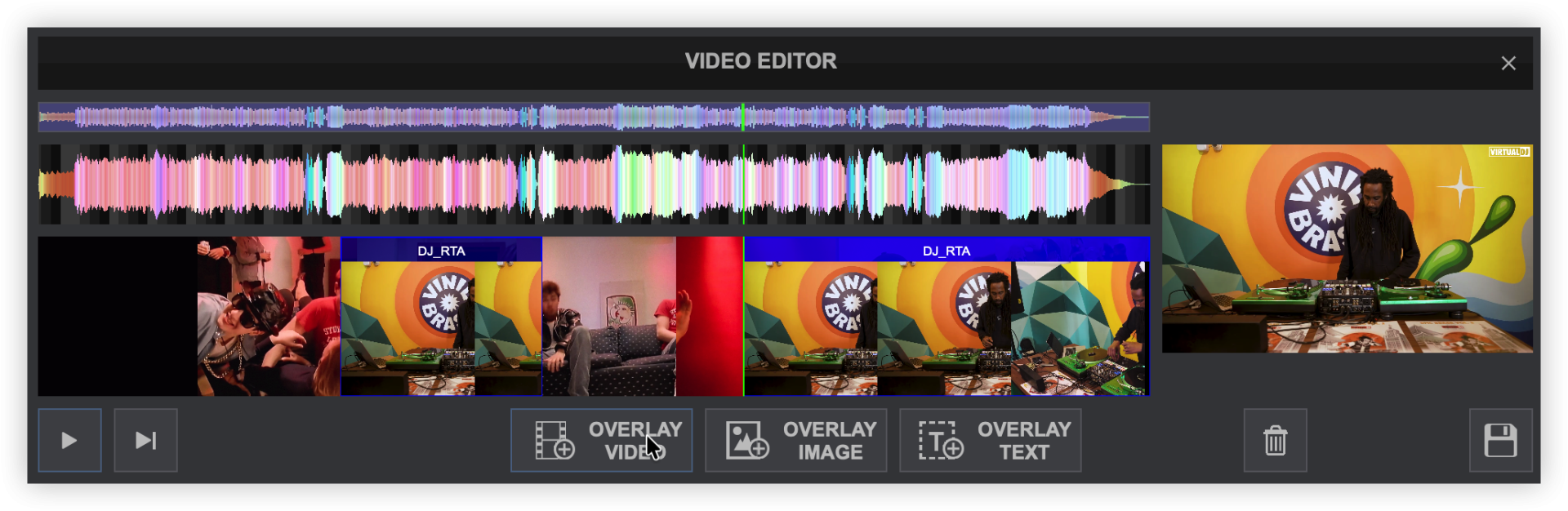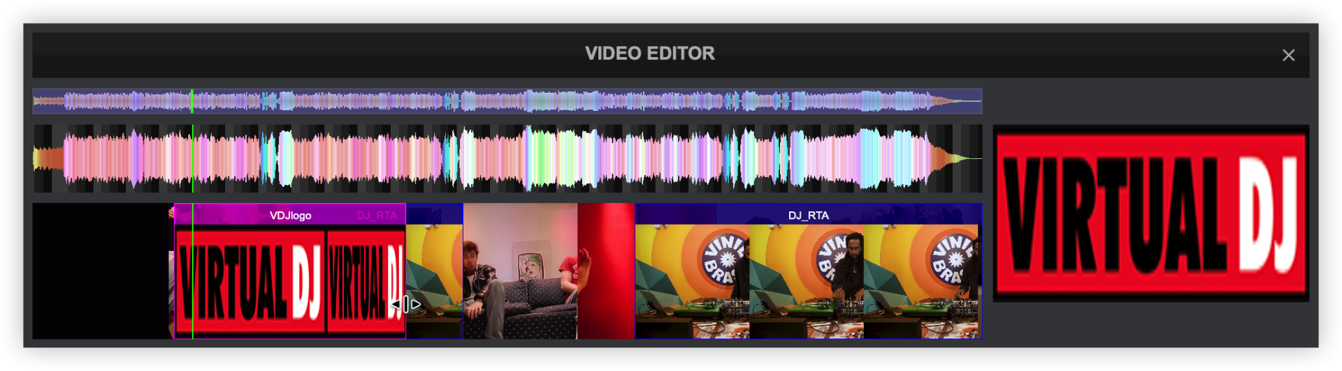 The Video Editor provides the ability to overlay video files and text over an existing Audio or Video track and is available as a Right-click option to any track in the File list. The process is non-destructive (does not alter the original file) and creates a special .vdjedit file that can be loaded to a deck and used in place of the un-edited original file.