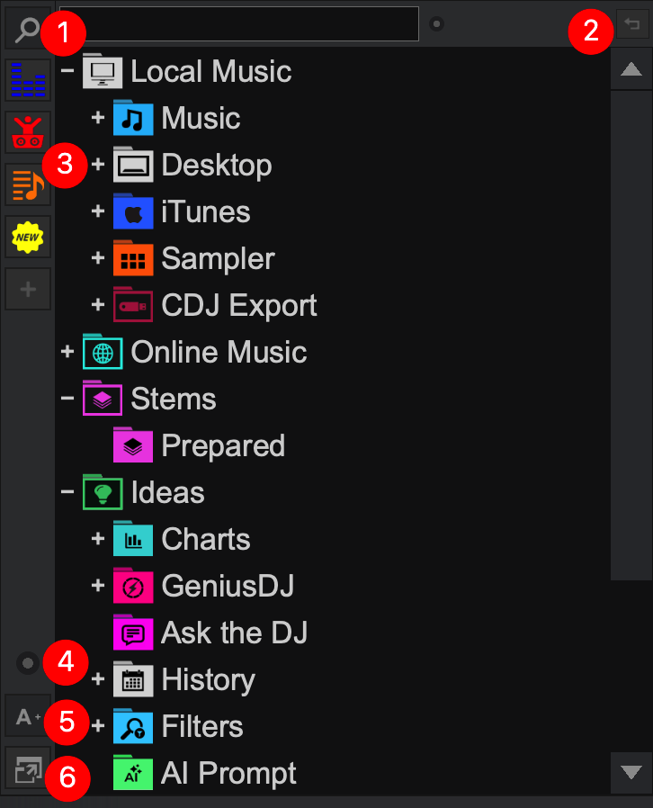 The Side Toolbar on the left vertical side of the Browser offers global folder operations and Browser features to quickly make changes and add functionality without interrupting the DJ's work flow. - FOLDER SEARCH. Quickly search for folders in the side toolbar. Right-clicking the search icon will return to the previous folder.